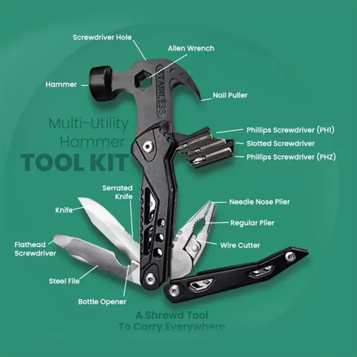 - Multiutility: Ideal for home use, camping, fishing, hiking, DIY jobs and a great multitool hammer! Can cut, pry, twist the screw, saw wood, strong enough to shatter the glass curtain wall, cut the rope curtain in a dangerous escape etc.